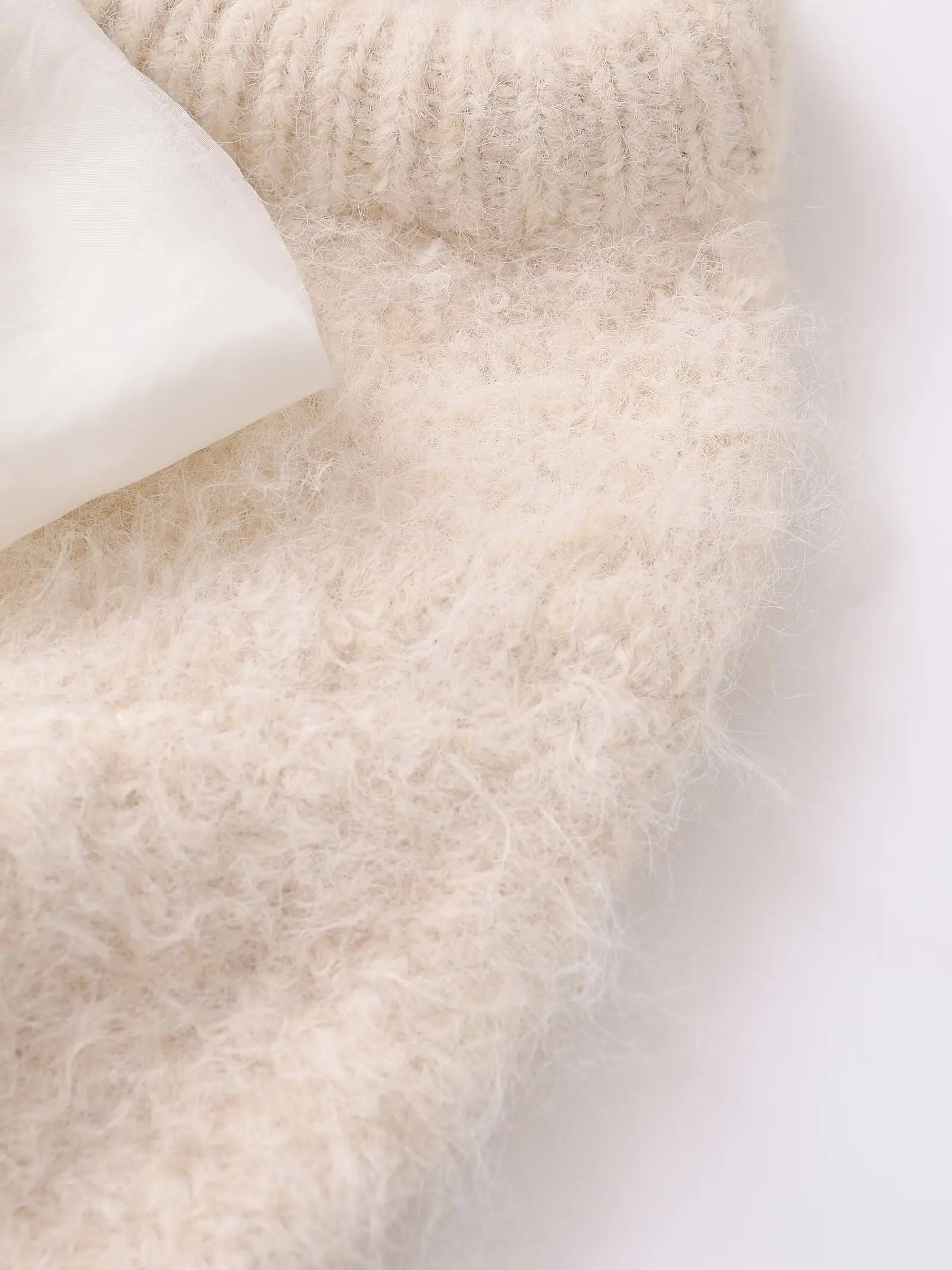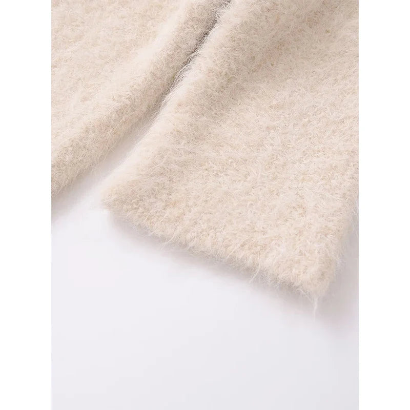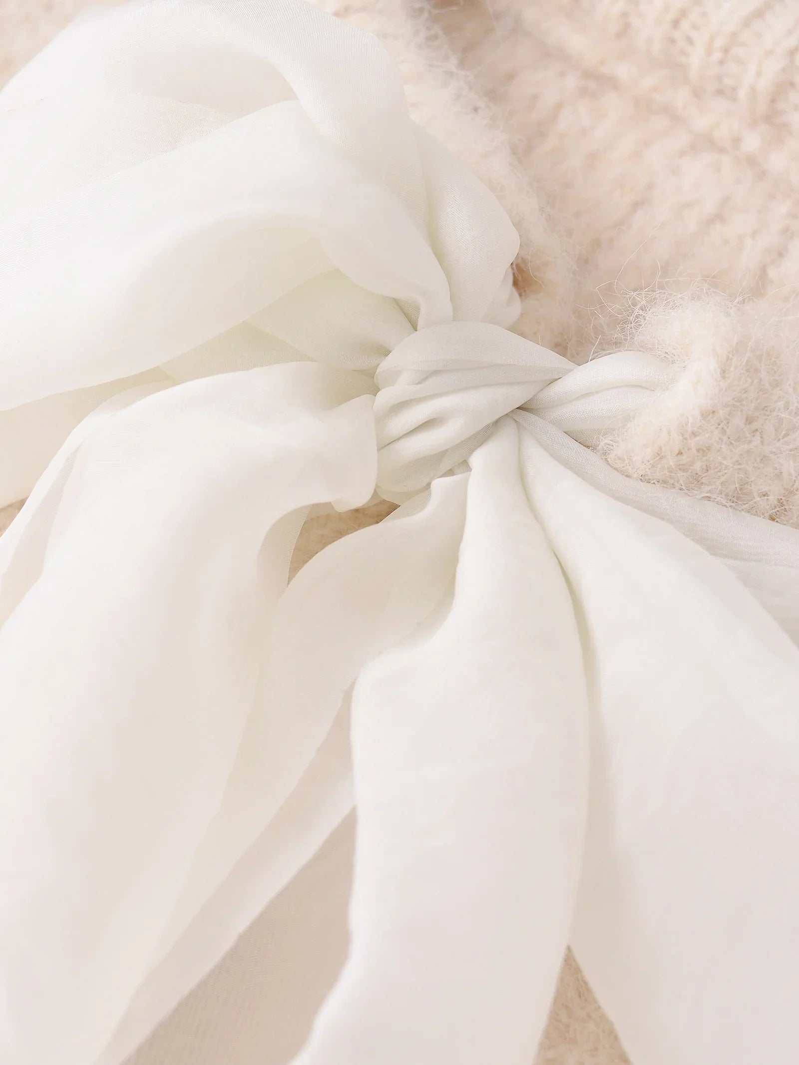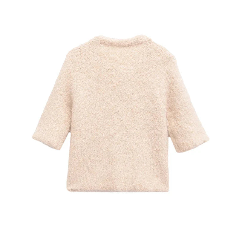 The Carol Knit Top is a timeless. cozy sweater featuring a soft knit texture and an elegant bow detail at the neckline. With its relaxed fit and mid-length sleeves. it's perfect for layering or wearing on its own.