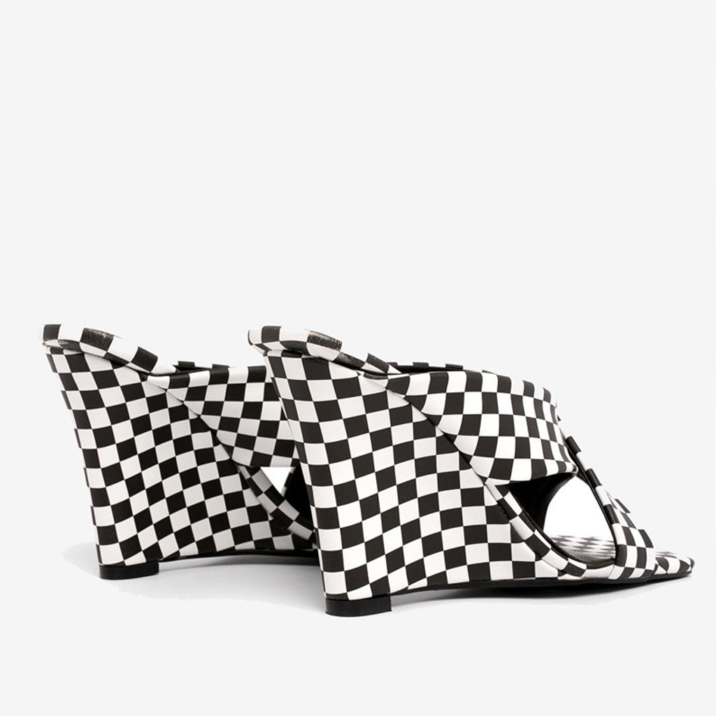Embrace the black and white aesthetic with the help of these wedge heels' archival prints. Presented in black and white combination. this work of art adorns two versions of the super trendy style: retro stripe print and stylish checkerboard print. Made from high quality patent leather with slick texture. this pair has commanding square toes before ending with wedge-style tapered heels. Bound to lend you style and elegance. they are accented by a criss-cross effect with wide upper bands and the easy slide style brings irresistible sensuality and female-inspired take on the black-and-white aesthetic. Turn on the diva mode with this simply chic style and win tons of compliments!