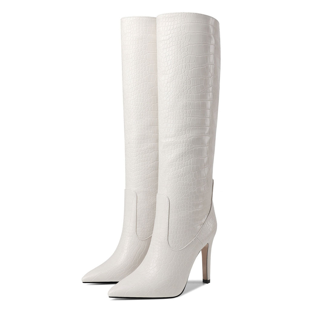 Promising to leave a lasting impression. these sleek boots are the ultimate take-notice design and a must-have choice for the upcoming seasons. Made from high-quality faux leather. this pair gives off an upscale sense from the crocodile effect throughout. The tonal stitching around the ankle makes it a firm-fitting silhouette for your feet while the wide shaft does well in wrapping your leg under the knee. Anchored by a thin stiletto heel. this statement pair is enhanced with an elongated pointy toe at the front that reflect an explicit sensuality and female inspired aesthetic. This style goes well with skin-tight jeans and mini dresses or skirts which is a perfect don for casual daily wear. Remember: things come and go. but these boots always stay.