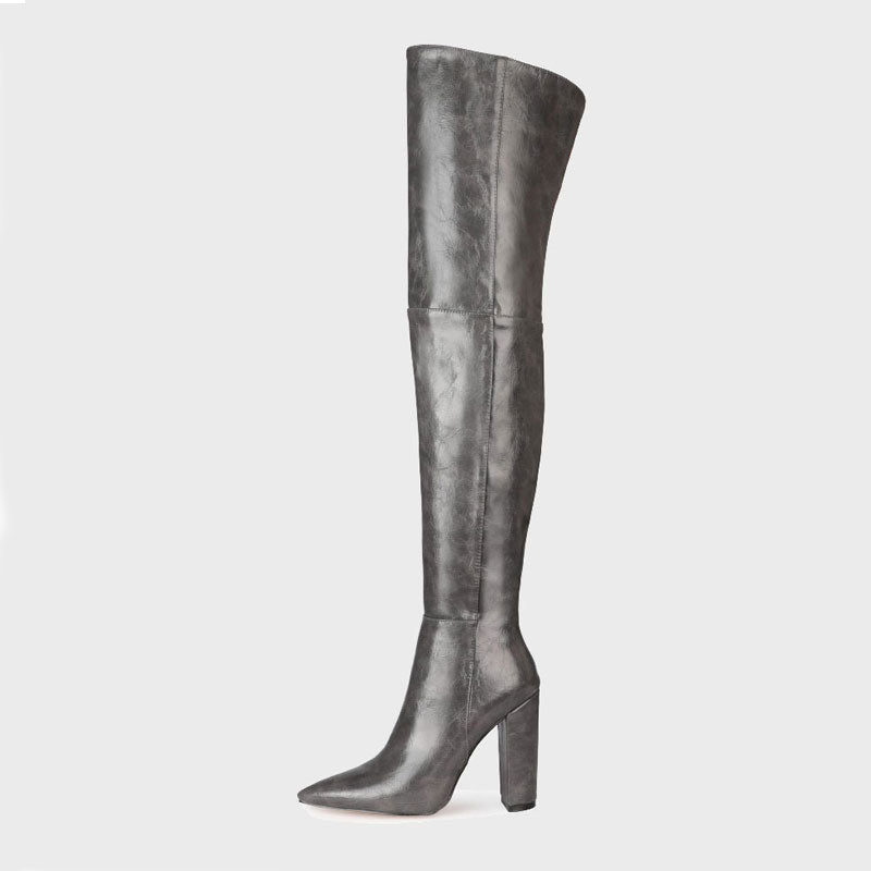 Chic Faux Leather Over Knee Pointed Toe Block Heel Boots - Grey