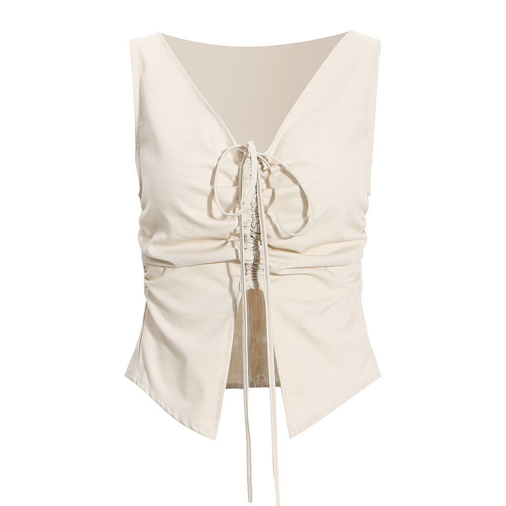 This sleeveless crop top from Luxe's designer collection will be your most versatile top for the summer. Available in off white and classic black hues. the stylish design features a chic V neckline with drawstrings to the central front. creating oh-so chic ruched details for your personalized style. The split vented V-shaped hemline flatters the waist and the tailored fit is finished with a hidden rear zip closure. Wear it solo with a pair of suit pants and heels for an instant put together look. or match it with our crop shirt and a pair of distressed pants.