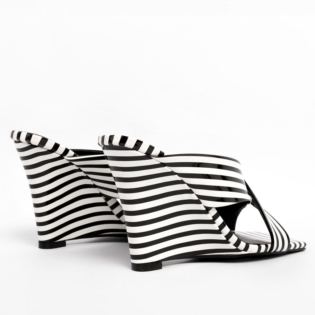 Embrace the black and white aesthetic with the help of these wedge heels' archival prints. Presented in black and white combination. this work of art adorns two versions of the super trendy style: retro stripe print and stylish checkerboard print. Made from high quality patent leather with slick texture. this pair has commanding square toes before ending with wedge-style tapered heels. Bound to lend you style and elegance. they are accented by a criss-cross effect with wide upper bands and the easy slide style brings irresistible sensuality and female-inspired take on the black-and-white aesthetic. Turn on the diva mode with this simply chic style and win tons of compliments!