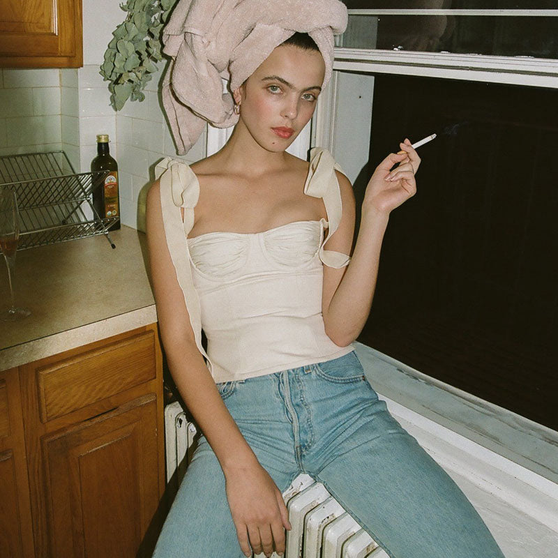 This crop top is chic and cool. Crafted with blend cotton and polyester. embellished with self-tie bow ties in contrast color. featuring a slim fit cut structured with a ruched detail sweetheart neckline. a covered elastic bustline. and a bare midriff cut at the waist. Find more trendy women's cropped tops or unique clothing in our boutique. and just add jeans and sneakers to complete a cute look.