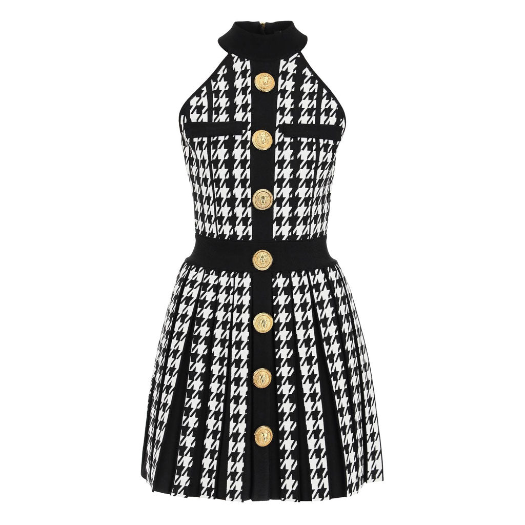 LUXE designer dress turns up the preppy volume for trans-seasons. letting the modern preppy knit icons lead the way down a bolder and chicer path for the season. Made with soft springy viscose fabric in the classic black and white combination. the houndstooth printed dress gives you a preppy twist in the fit-and-flare cut. which features a mock neckline. sleeveless design and is highlighted with the gold-tone embossed buttons to the front. The fitted waist is followed by the slightly poofy mini skirt with godet pleats. Style yours with heels and a handbag to rock an effortless and natural makeup look.