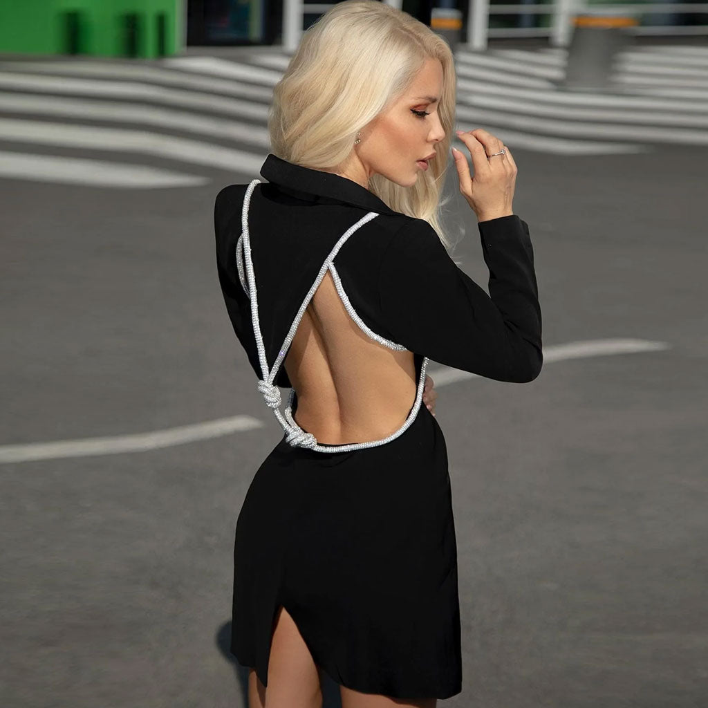 It's bound to be a masterclass edit in your blazer collection. This sophisticated dress is tailored into a sheath silhouette for you to look drop-dead gorgeous from every angle. especially when the strategic ribcage cut-outs lead its way to the jaw-dropping backless style which is traced with shimmering rhinestone piping construction and a double-knot draping at the central back. It also stuns with a very open V-silhouette along the neck which is followed by a tonal single-breasted button closure and decorative curved pockets at the front. Accentuated by the back slit. it exudes a seductive take on this enticing piece which is assured to garner attention wherever you go.