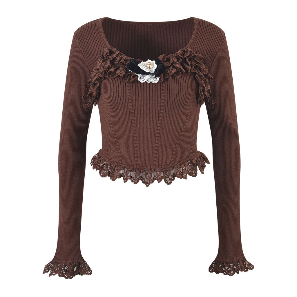 Dive into retro vibes with our vintage-style ribbed knit top. available in classic White. Coffee. and Black. This sweet designer knitted top boasts a chic U-shaped neckline. adorned with an adorable bow-trimmed accent for that extra dash of charm. Its long sleeves end in delicate. lacey cuffs. while the cropped length is playfully finished with ruffled laces. The top's front features subtle yet exquisite top-stitching. adding a touch of texture and sophistication. Made from a cozy acrylic and cotton blend. it's the perfect mix of old-school cool and modern comfort.