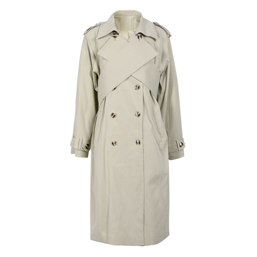Redefining classic elegance. our designer light khaki trench coat calls out to you. The quintessential spread collar and shoulder epaulets with tabs exude an enduring charm. Meanwhile. the front double-breasted placket. combined with a detachable criss-cross design that boasts a buckled fastening at the rear waist. introduces a visionary twist. Enhanced by long sleeves featuring tabbed cuffs. and complemented by slanted side pockets. this classy jacket achieves an impeccable balance between utility and style. Whether it's a formal soirée or a casual urban escapade. this suit jacket effortlessly elevates your ensemble. making it an essential companion for any occasion.