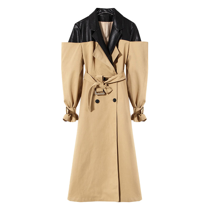 Luxedress designer brand's empowered essence defines this trench coat. The signature panel design combines the sleek vegan leather blazer and classic trench coat style giving you a contemporary take on the deconstructed fashion. featuring a lapel collar. double breasted closure and loops to help cinch the waist with the matching belt strap. The oversized sleeves are also finished with belted cuffs. lending you a simultaneously classic and avant-garde style. which is really worth the investment. Overlay upon your everyday outfit to keep warm during those days when the temperature's dropping. this khaki trench coat is just anything but boring.