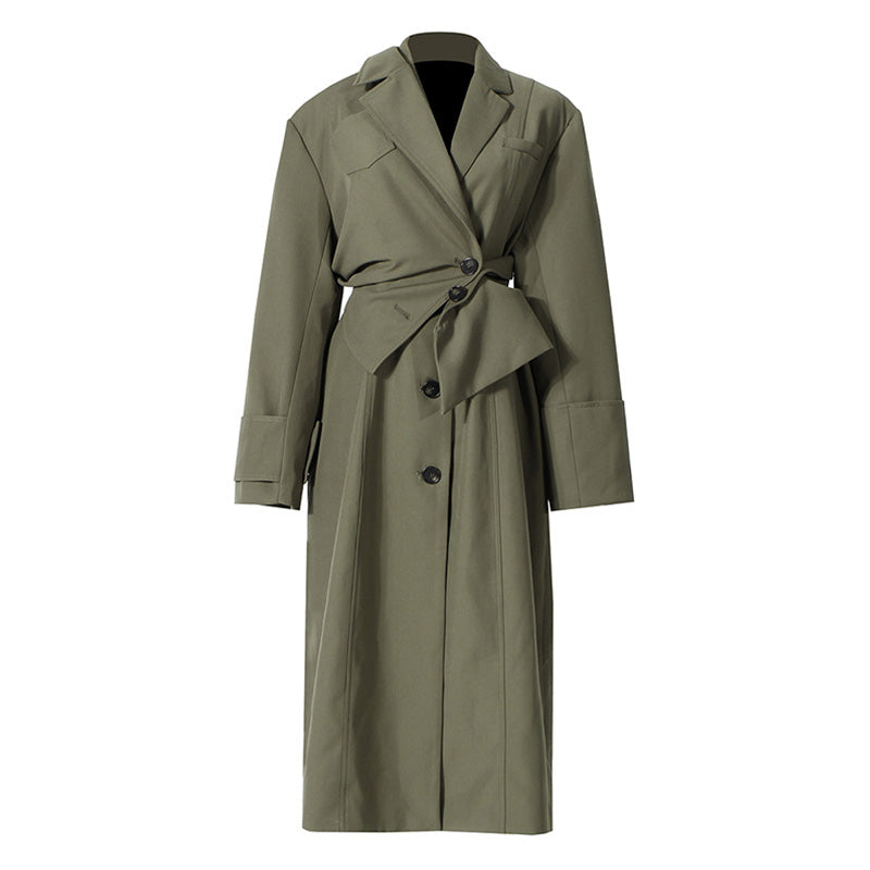 The asymmetric trench coat from our new designer collection presents a quirky deconstructed attitude to your trans-seasonal style. The olive green hue makes this piece so classic. with the chic notched lapel collar and a row of buttons to the front. The duster coat boasts an asymmetric single-sleeve silhouette. which is designed to be layered under the shorter one with another sleeve on and ultimately fastened with side buttons to finish off the contemporary look. As for styling tips. opt for a fitted midi dress and sleek pumps for a more elegant take on the contemporary style.