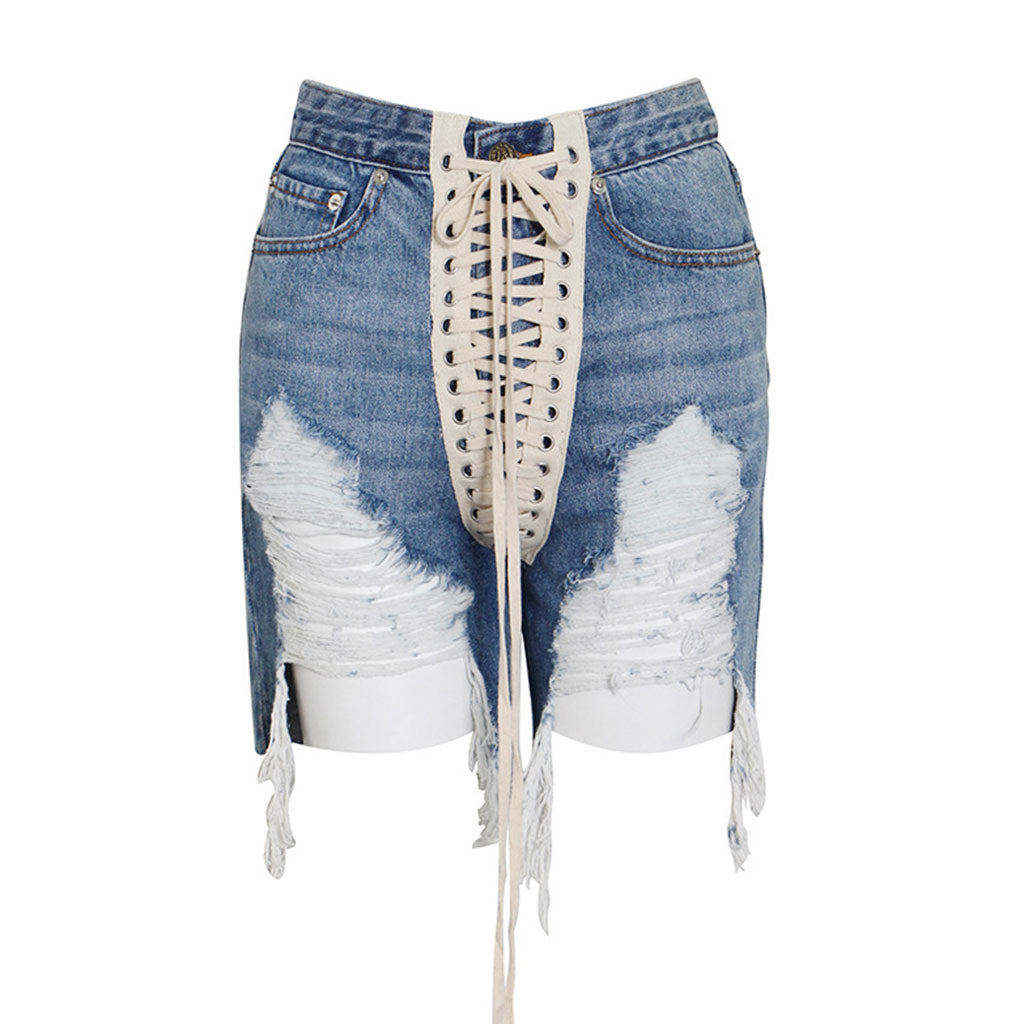 These jean shorts got all the best features of a classic denim pair but with a sassy contemporary update! Made from our designer brand to stand out from the crowd. this pair is in a mid-blue wash and features five pockets. belt loops. button-zip fastening and a raw-cut edge. The modern ripped detail and chic whiskers give plenty of personality to your summer look. We love the lace-up construction that brings a unique contrasting aesthetic. Wear this short when you're feeling yourself and set the world on fire.