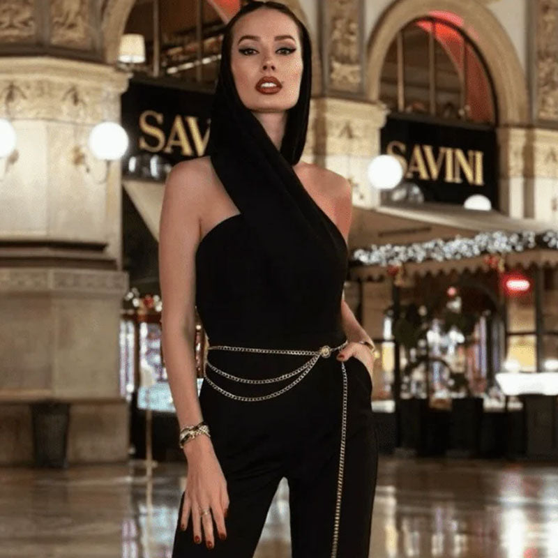 A cutting-edge sleeveless jumpsuit exudes sleek style. With its crossed design at the front and open back. this black designer jumpsuit elevates fashion to the next level. The high-waisted feature. combined with convenient side pockets. offers both functionality and trendsetting appeal. But it doesn't end there - the flared hem adds a touch of sophistication. while the hood detail brings a contemporary edge. This hooded jumpsuit embodies modernity and sophistication. making it an ultra-mod outfit to go to.