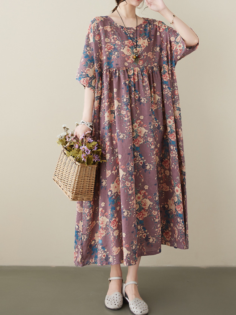 The Women's Cotton Round Neck Floral Smock Dress is a charming and comfortable garment made from high-quality cotton material. With its soft and breathable fabric. this dress offers a delightful experience for any woman wearing it.The dress comes in a lovely shade of purple. adding a touch of elegance and sophistication to your wardrobe. The purple color is vibrant and eye-catching. perfect for both casual and semi-formal occasions.Embracing a retro style. this smock dress effortlessly combines vintage-inspired elements with modern comfort. The retro design features a round neck. which adds a classic and timeless appeal to the overall look.The smock dress is characterized by its loose and relaxed fit. allowing for ease of movement and a flattering silhouette. It is designed to drape gracefully on the body. making it suitable for various body shapes and sizes.