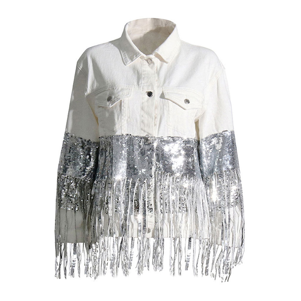 Slip into the sparkling embellished denim jacket and experience the magic of fashion come to life. This stunning designer jacket envelops you in a feeling of luxurious comfort and style. as the thick denim fabric and elegant design create a sense of effortless sophistication. The sequin fringes add a touch of playful charm. making you feel like the center of attention wherever you go. With its classic fold-over collar. flap patch pockets. and boxy silhouette. this jacket is the perfect blend of timeless elegance and modern creativity. Wear it with confidence and let the world see the beauty of your style.