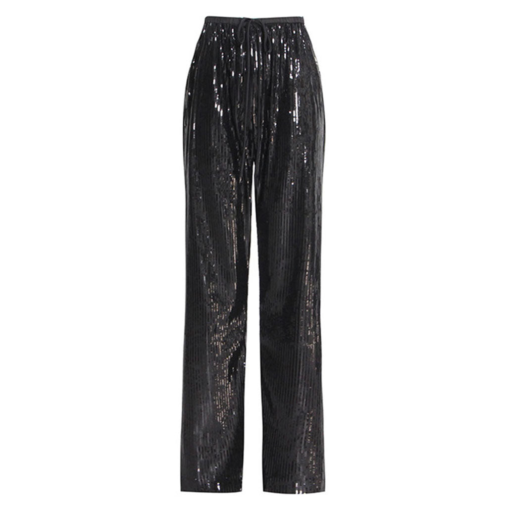 The ultimate statement party pants are trendy for any fashion-forward wardrobe. The drawstring tie at the waistband ensures a comfortable and secure fit. while the straight leg design offers a flattering silhouette. The wide hem adds an extra touch of style. making these pants perfect for both formal occasions and casual outings. But that's not all - these pants also come equipped with convenient zipped side pockets. providing a secure spot for your essentials on the go. Whether you're out for a night on the town or running errands. these sparkly designer sequined pants have got you covered.
