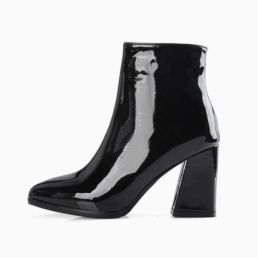 This pair of ankle boots adds a cool touch to your everyday wear. Crafted with PU enamel leather and rubber. stand out in high-shine vamp. featuring an ankle-height topline with zip fastening to one side. sharp pointed toes to the front. chunky heel along with rubber heel cap. and an anti-slip rubber outsole. Find more trendy women's boots and unique shoes in our boutique. and pair the stylish boots with everything from cropped denim to dresses and skirts for a modern chic street look- Heel height: 8 cm.
