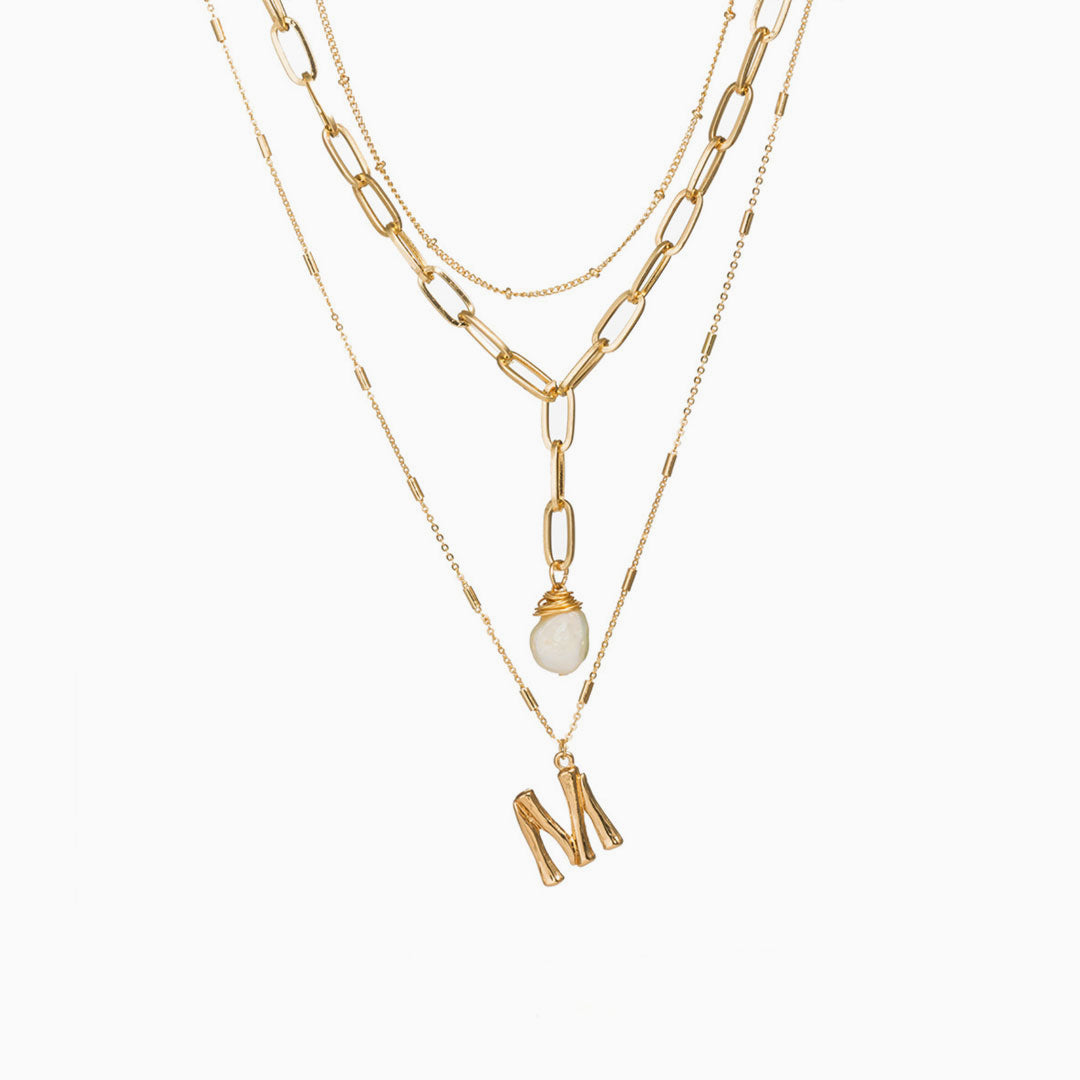 This layered necklace is a stand-out addition to your jewelry box. Crafted with gold plated alloy. sand out in a baroque style bead and letter M charms. featuring a treble-strand chain along with an adjustable fit and finished with a spring-ring fastening. Find more trendy women's necklaces and unique accessory in our boutique. and mix and match with other gold chains for a vintage look.