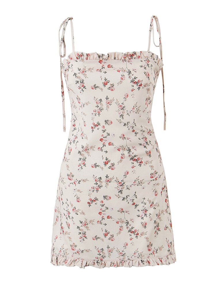 The "Heaven" dress is a delicate and feminine piece with soft floral prints and adjustable straps. The ruffled bottom hem and romantic pattern make it a charming addition to any wardrobe.
