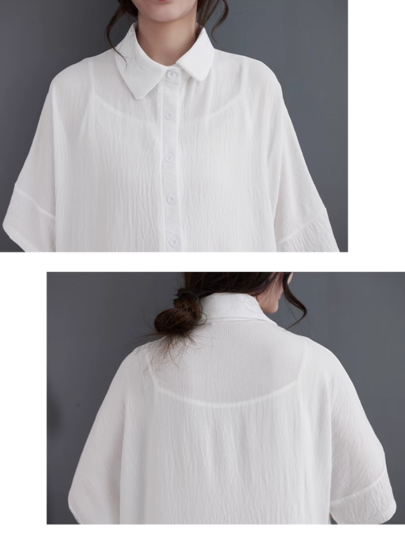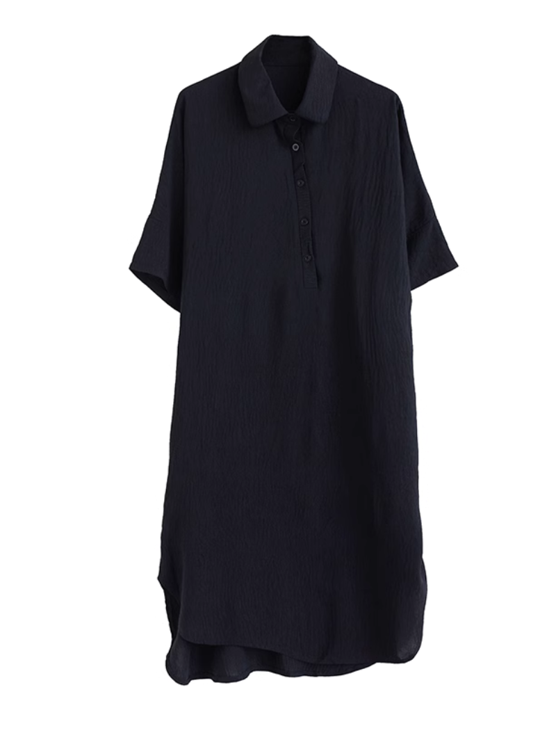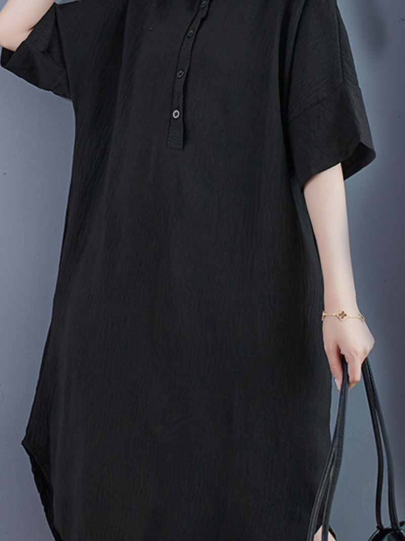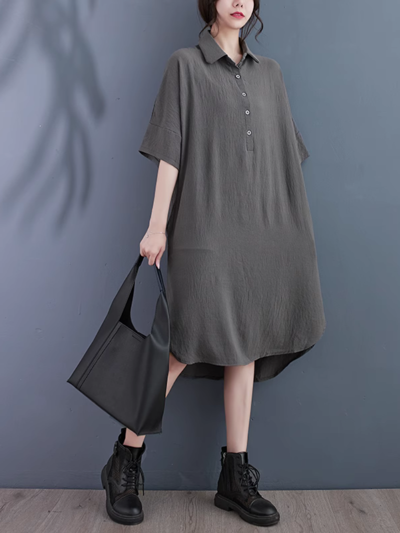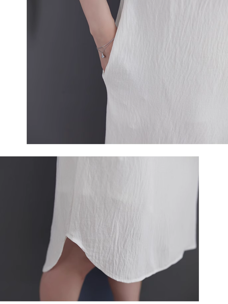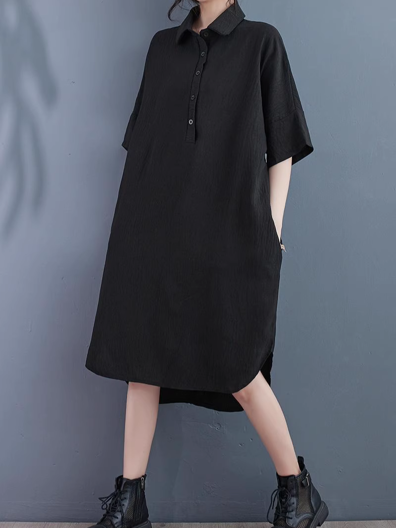 Women's Solid Color Shirt Dress. a versatile and chic addition to your wardrobe. Crafted from a blend of soft cotton and thin silk cloth. this dress offers a comfortable and breathable fit. The short sleeves provide a relaxed feel. while the regular sleeve type adds a touch of elegance. With its plain pattern. this dress is perfect for both casual and formal occasions. The one-size design ensures a flattering fit. with a length of 106cm. bust of 130cm. and sleeves measuring 43cm. Elevate your style effortlessly with this timeless and effortlessly stylish shirt dress.