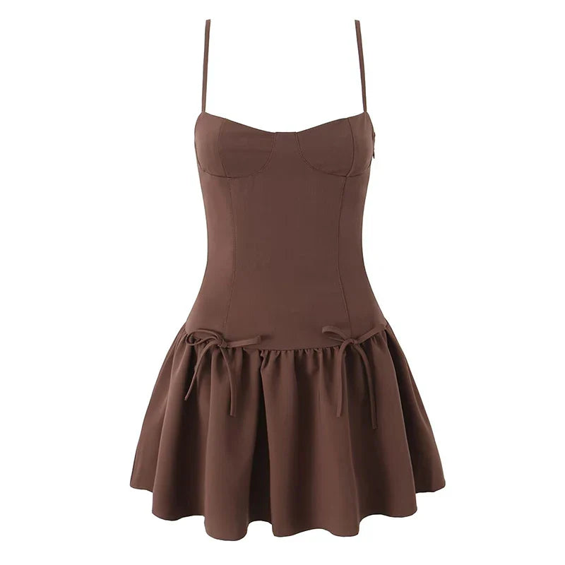 The Hot Cocoa Dress is a charming mini dress featuring a fitted bodice. flared skirt. and adjustable bows. perfect for cozy yet stylish occasions.