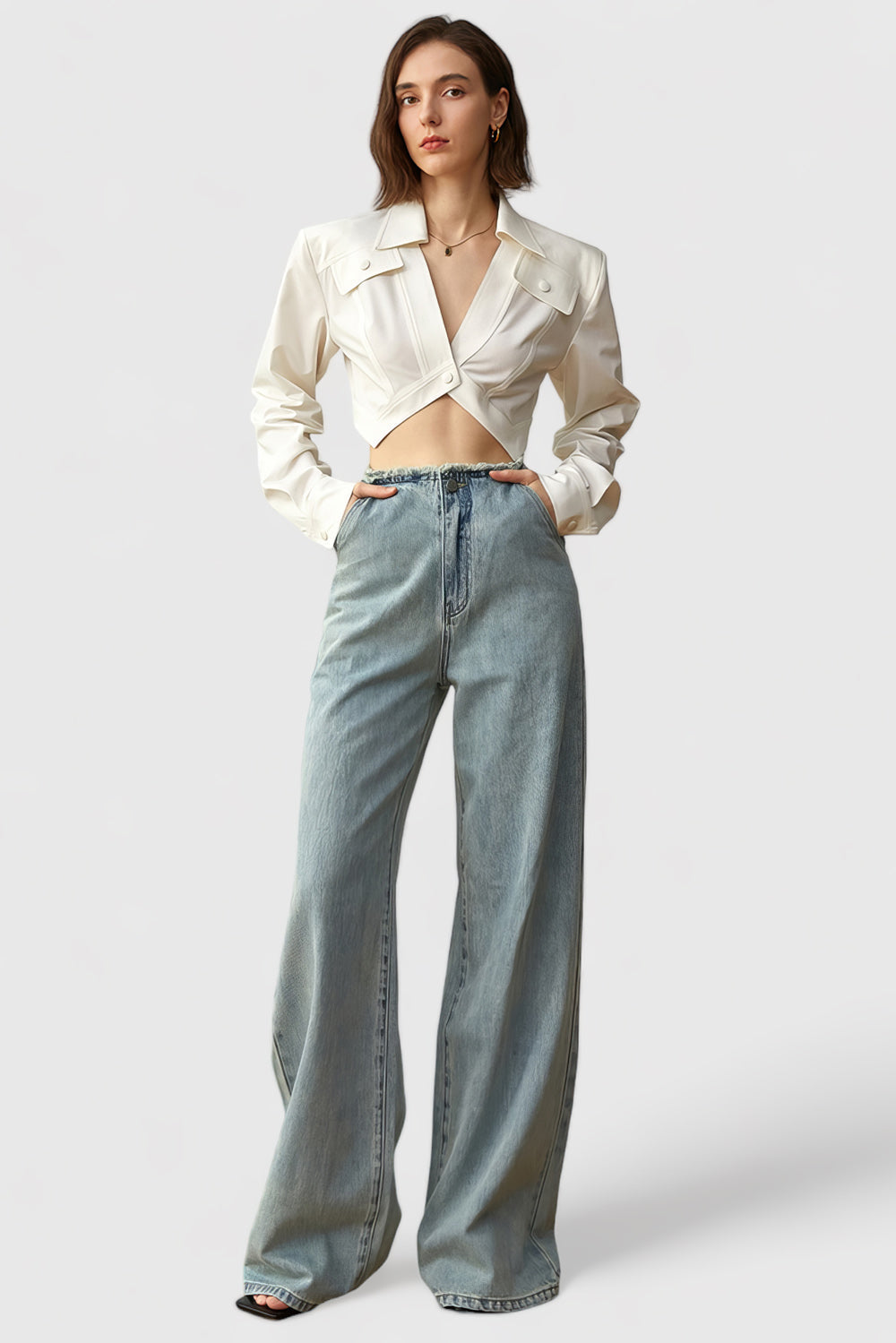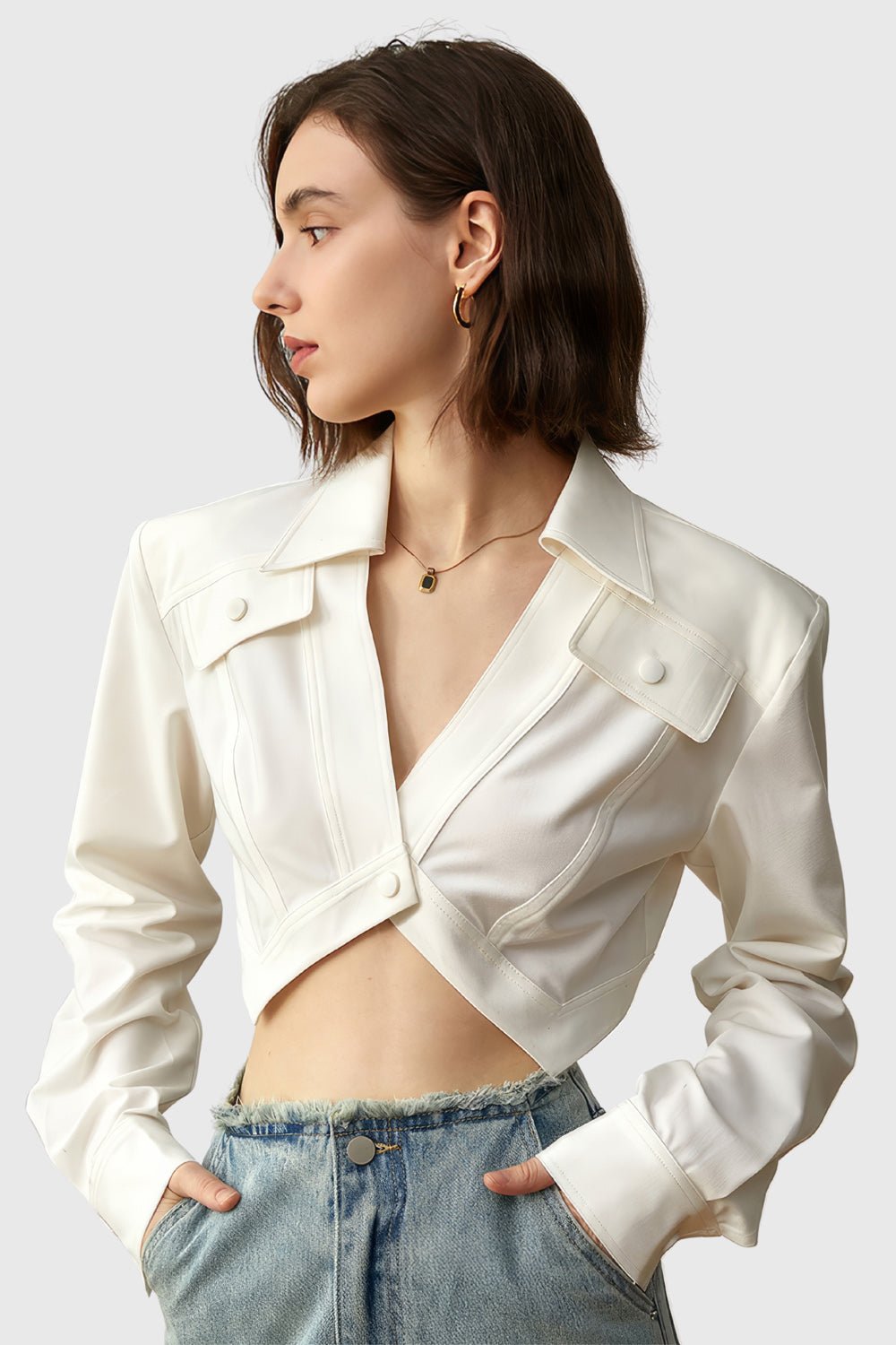 This Irregular Cropped Shirt is perfect for casual days. It features one button closure. long sleeves. pocket flaps and a collar with padded shoulders for a comfortable fit. With its unique. irregular design. you'll stand out from the crowd in style.