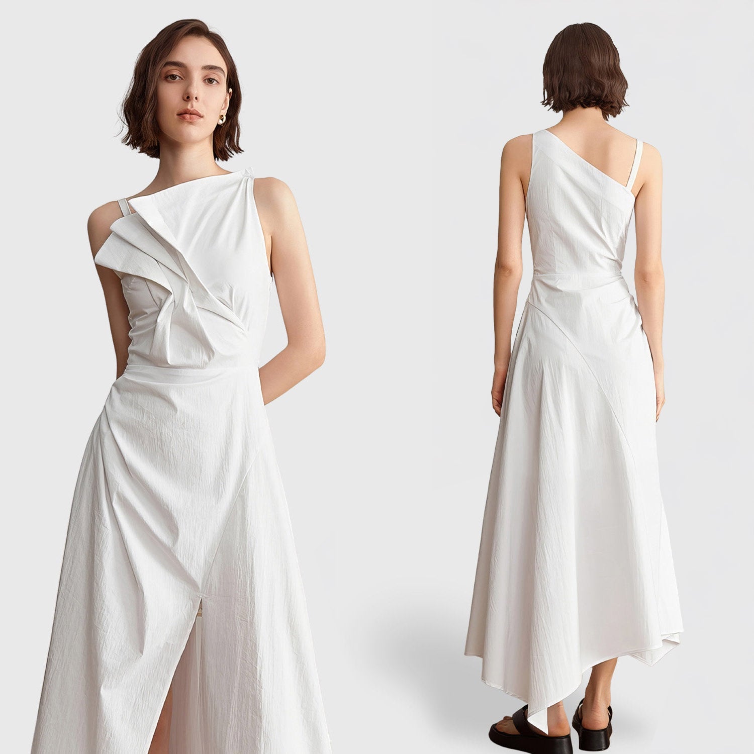 This unique design adds an intriguing element to any outfit with its one strap. sleeveless look. and asymmetrical front slit. Crafted with comfortable materials and intricate details. this dress is sure to make a statement.