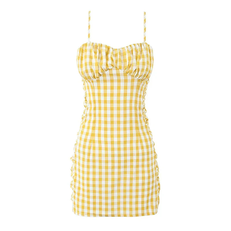 The Julie Dress is a cheerful yellow gingham dress that hugs your figure with its ruched sides and delicate straps. It is perfect for warm days. offering both comfort and style.
