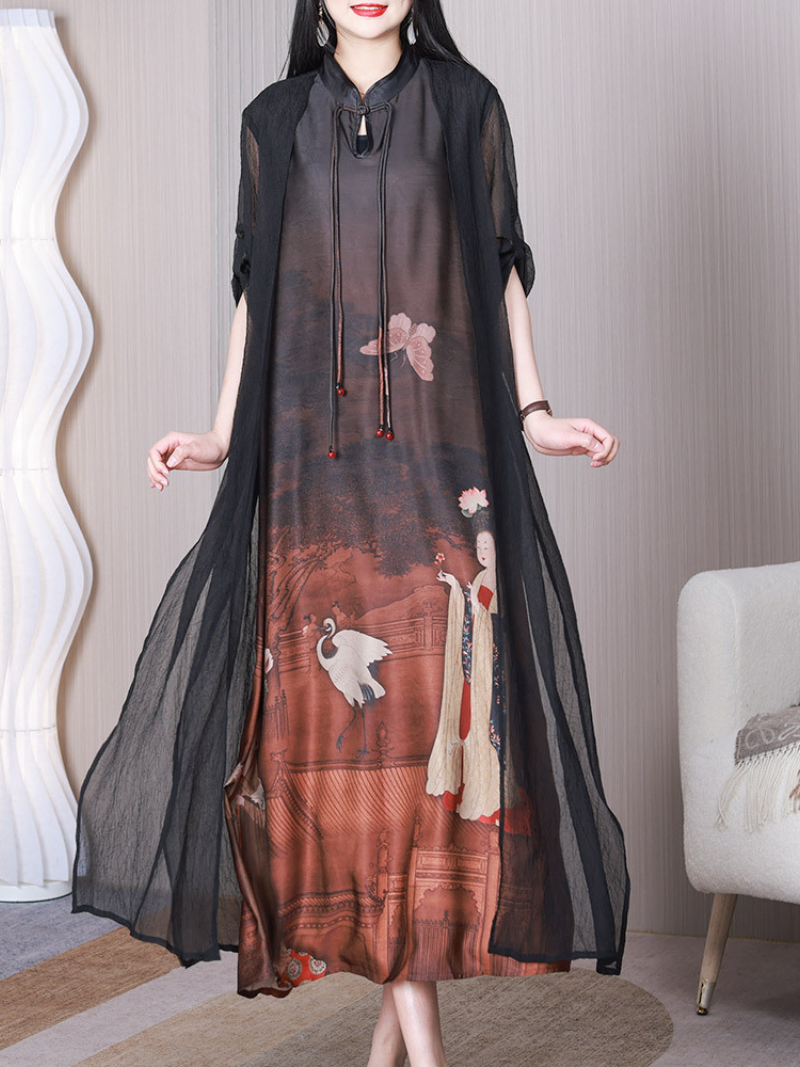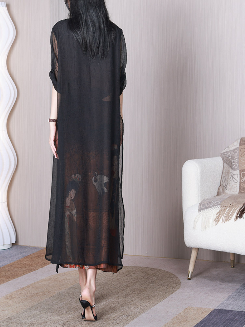 This stunning black dress is crafted from a luxurious blend of Cloud Satin (80%) and Blended Silk (20%). The combination of these high-quality fabrics provides a soft and smooth feel against the skin. making it comfortable to wear for extended periods. The dress features a unique animal pattern that adds a touch of glamour and playfulness to the design. It also has a stand collar that enhances the sophistication of the dress. making it perfect for formal events. The dress is designed with a middle waist that cinches the waistline and creates a flattering silhouette that is sure to turn heads. Whether you're attending a gala or a cocktail party. this dress is sure to make a bold statement.
