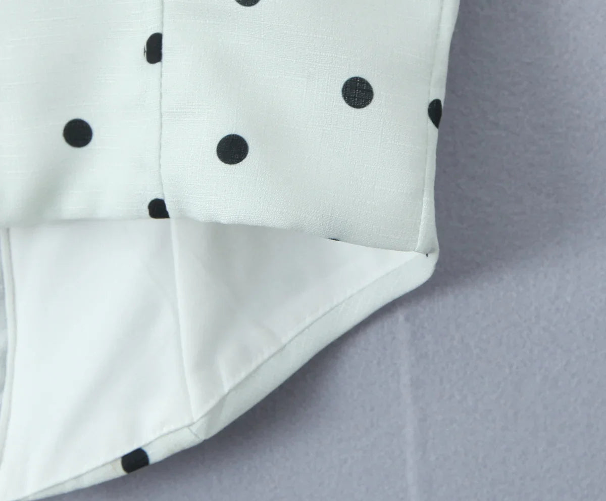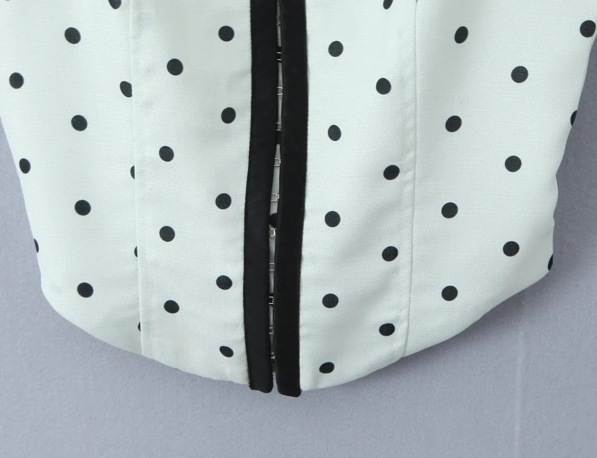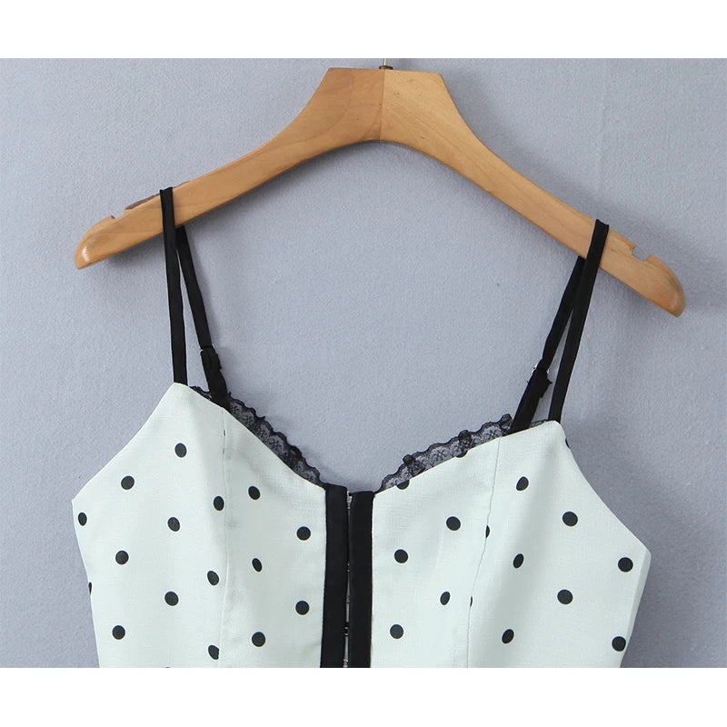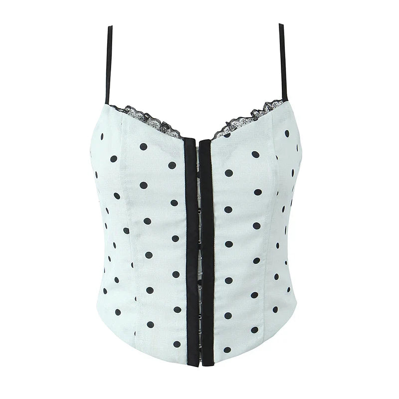 The Kendrick Top is a stylish and sophisticated polka dot bustier top with black trim and lace details. The structured fit and elegant design make it perfect for both casual and dressy occasions.