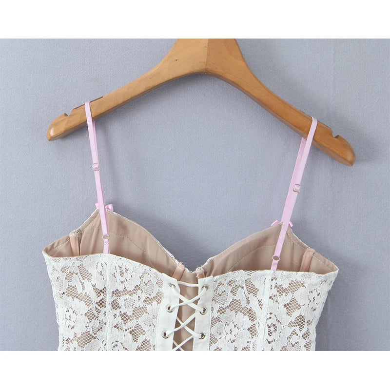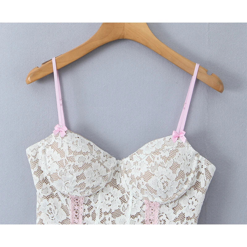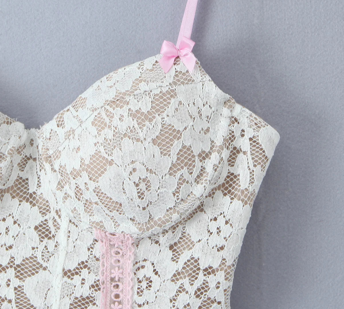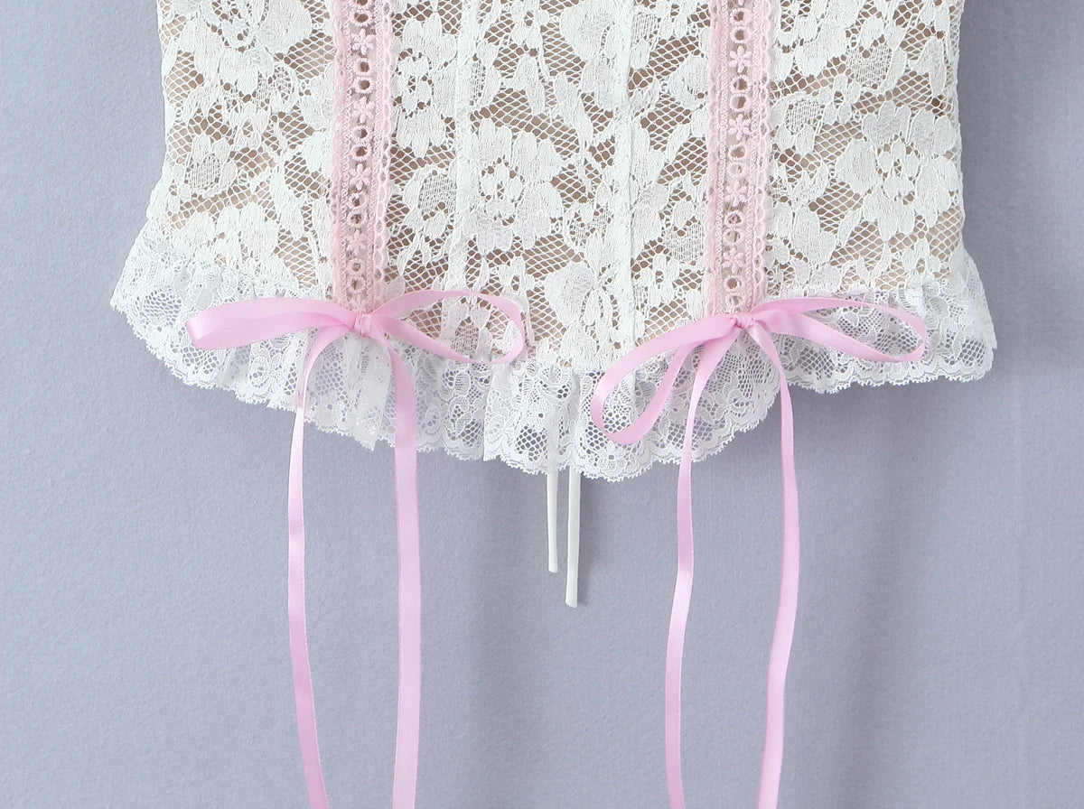 The Kiera Top is a stunning lace corset top that features a delicate floral pattern and beautiful pink ribbon details. It offers a flattering fit and would be perfect for pairing with skirts or trousers.