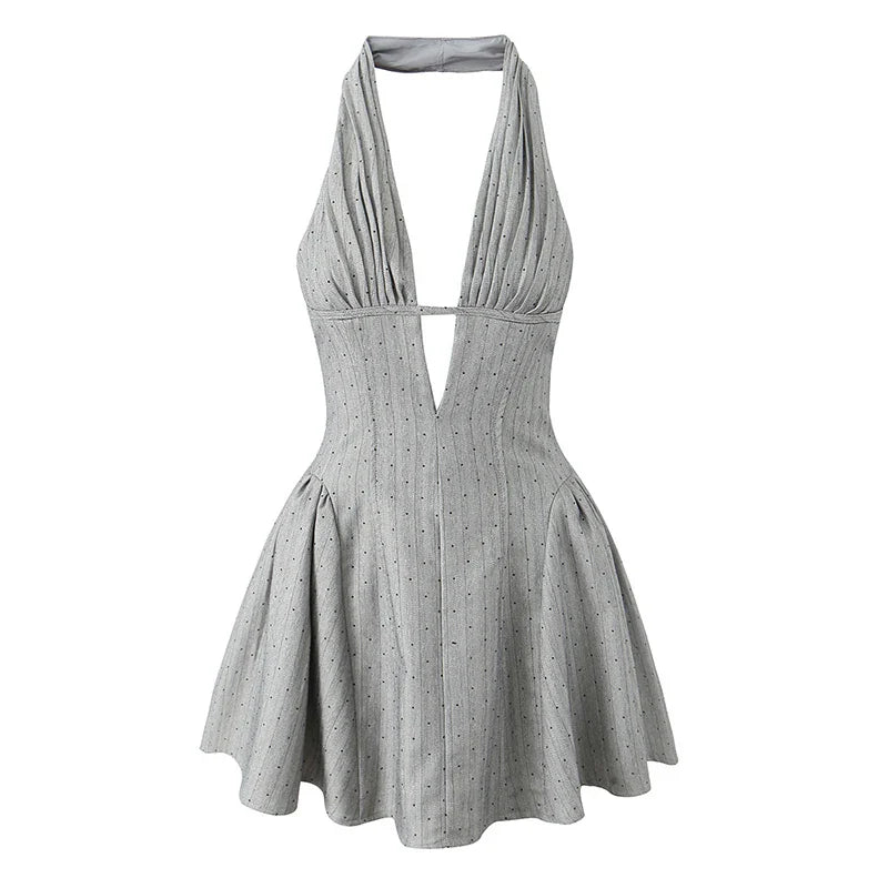 The Kim Dress is an elegant halter dress with a flattering fit and flare shape. featuring a plunging neckline and back detail. perfect for any event where you want to make a statement. The dress is made with a pinstriped fabric for added texture and visual interest.