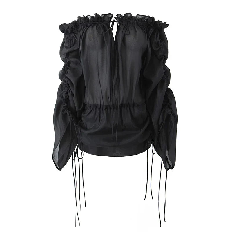 The Kissing Booth See-Through Dress is a chic and airy piece available in black and baby blue. It features an adjustable waist and statement sleeves. making it perfect for any occasion.