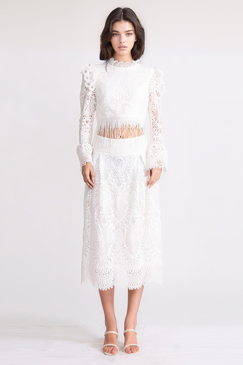 This elegant two-piece lace set consists of a long sleeve top with a high lace neckline and fringe hem. paired perfectly with a midi skirt with a broad waistline. Crafted from high-quality lace. this classic look is ideal for special occasions or nights out.
