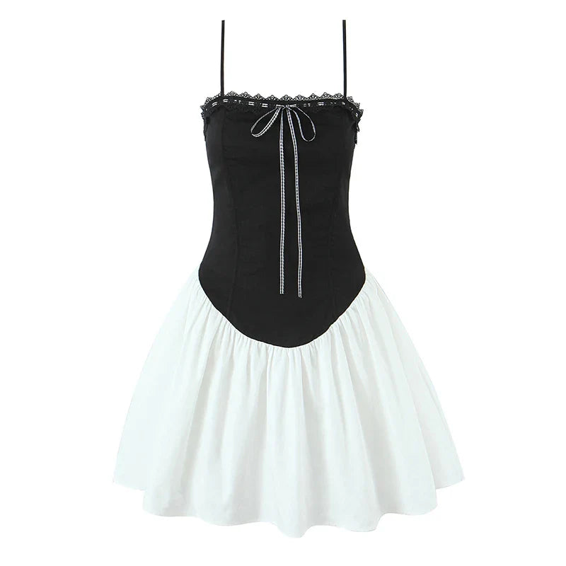 The Lenora // Dress is a graceful black and white mini dress with a fitted bodice and full gathered skirt. With delicate lace-trim straps and ribbon detail. it evokes classic elegance with a modern twist—perfect for garden parties or romantic evenings.
