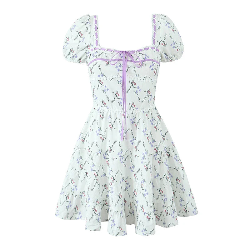 The **Lilibet Dress** features a soft floral design with a delicate tie at the front. Its comfortable. breathable fabric and playful puffed sleeves make it perfect for warm weather and casual outings.