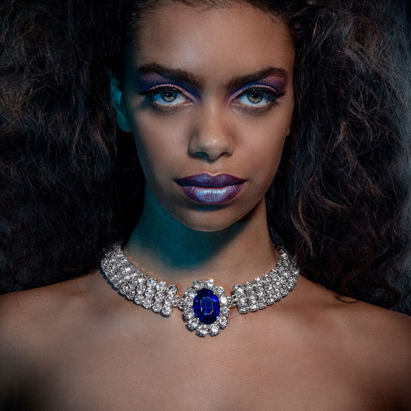 Exquisite and classy. this opulent necklace is characterized by timeless elegance and classic luxury. The classy piece features a central oval-cut gemstone with faceted surface. The faux sapphire stone is framed with a clear crystal halo. adding sparkle to your look. A trio of rhinestone chains adorn the necklace with shimmers to illuminate the skin. It's finished with a clasp closure for secured fit. It works magically in all dressy looks. Perfect to dress up your style. it'll certainly not go unnoticed.