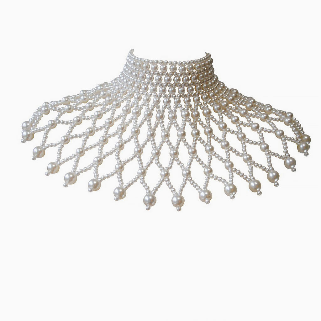 Without saying a word �our designer imitation pearl shawl top embodies quiet luxury! This exquisite beaded bodychain. woven with dainty and enlarged beads. is paired with a multi-strand choker for an effortlessly chic look that speaks volumes.