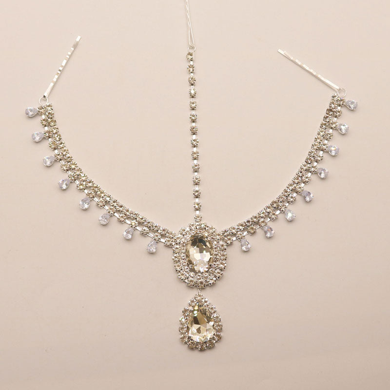 An ornament on the head with a luxury finishing touch. Made with white clear crystals and silver plated shine. a trio of head chains is secured with a trio of pin-finish to slide into your hair. The huge gem is circulated by the rhinestones and is further followed by a hanging teardrop gem detail framing the face. The forehead chains rest gently from sides to the front. with glittering drops that swing with your movement. Wear yours with loose curls or waves for a romantic look. which is sure to let you be the center of attention.