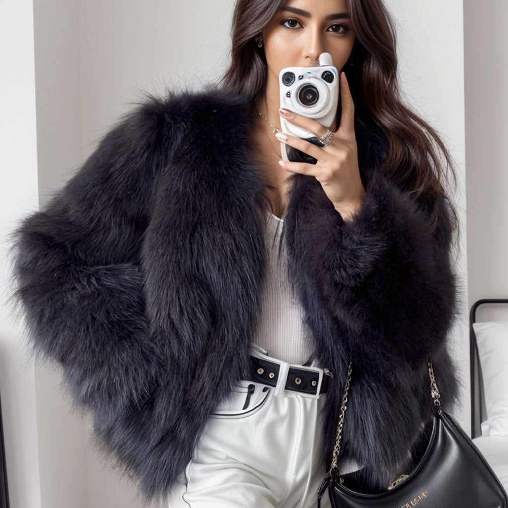 Meet the icon - this sumptuous winter jacket transcends seasons. exuding timeless elegance. Crafted meticulously from the finest real fox fur and premium polyester. it's the epitome of luxury. Its chic design. with long sleeves and an exclusive front hook and bar closure. exudes sophistication. Lined for comfort and adorned with side pockets. this crop-length jacket blends functionality with flair. The stunning dark gray hue elevates this designer fur coat. marking the zenith of luxury fashion.