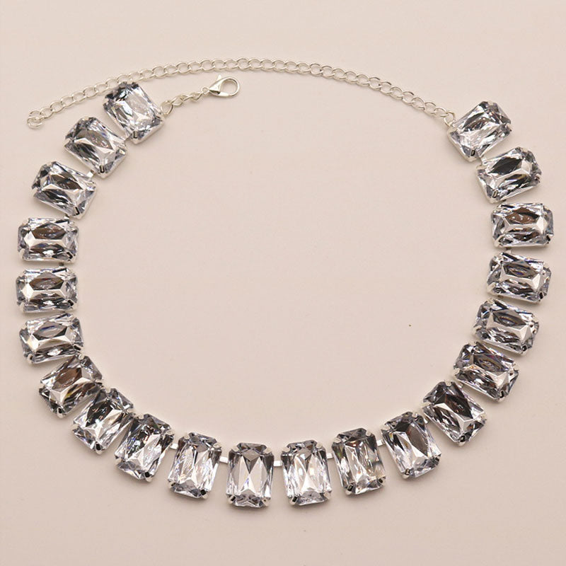Dress up to stand out in this stunning gemstone necklace. Designed to sit luminously against your skin and rest directly above the collarbone. this collar necklace is fully encrusted with giant clear faceted rhinestones in a sophisticated emerald-cut. The silver-plated construction is secured with an adjustable lobster clasp closure to the back. Luxuriously stylish looks perfect for the special events. style yours with a classic little black dress and heels.