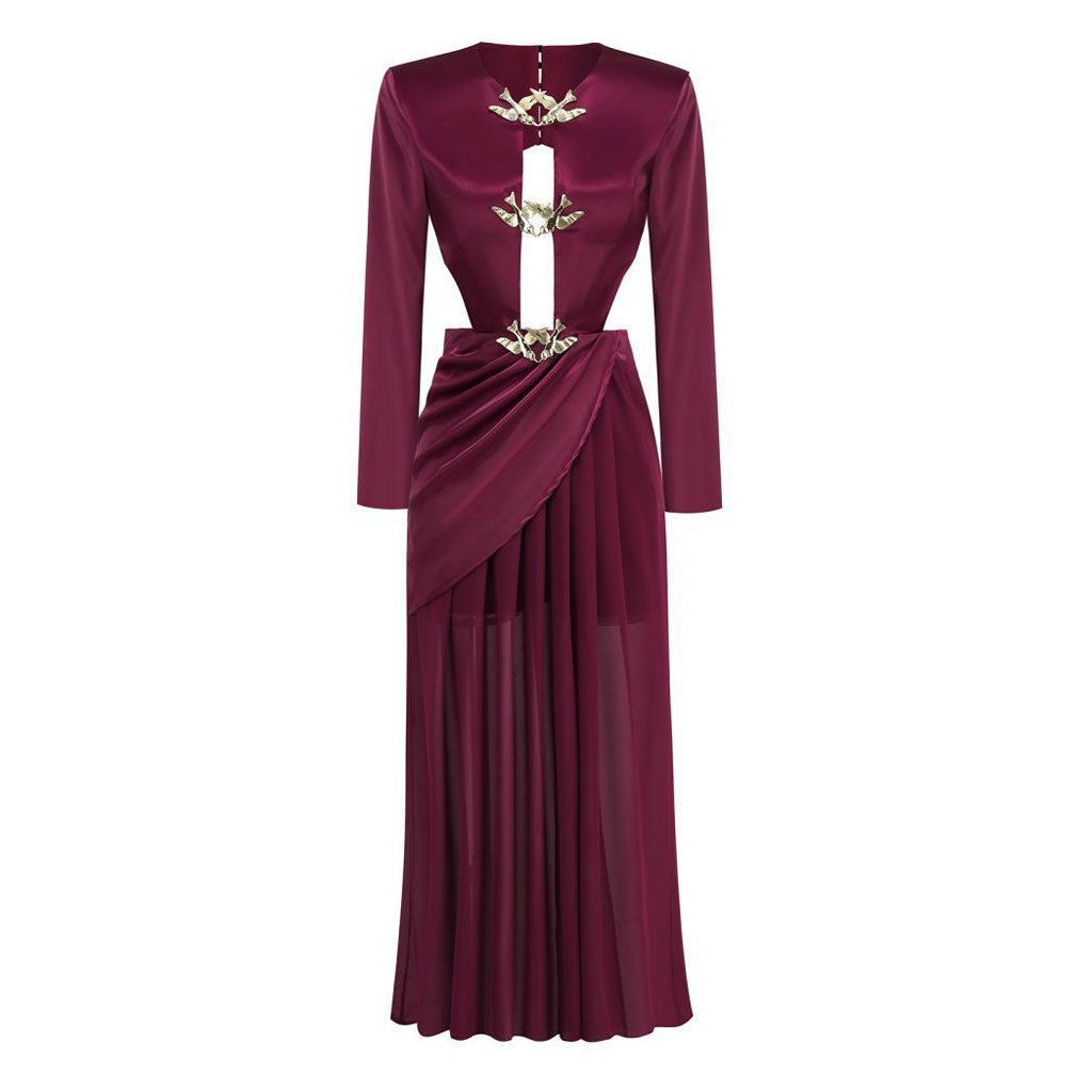 The designer prom dress showcases a daring deep V neckline. tastefully balanced by long sleeves. exuding allure and grace. The gold-tone bird accents at the front and a daring hollow-out back infuse intrigue and modern flair into the ensemble. Flowing from the ruched waist. the draped detailing adds an element of refined sophistication. while the high split offers a touch of sensuality and graceful movement. Thoughtfully designed back closures ensure a polished finish and ease of wear. Crafted from silky satin and lightweight chiffon. this luxury gown combines luxurious comfort with an ethereal and captivating silhouette. making it the perfect choice for those unforgettable evenings.