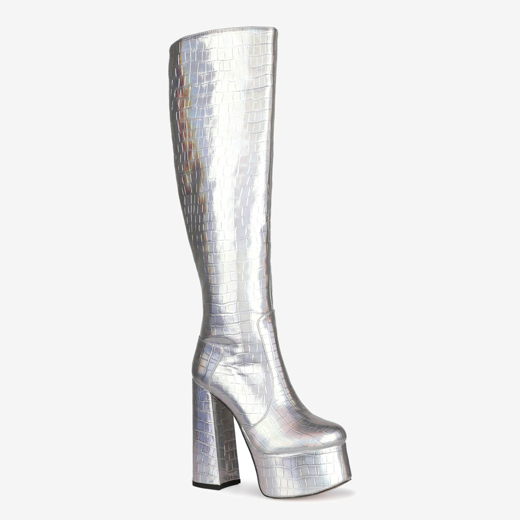 Adding audacious reptile prints to the knee-high silhouette is a total head-turner. Perfect to don for wild night outs. this sassy pair is imbued with showstopping credentials as it forms two versions of tactile raised pattern to choose from: crocodile effect and snake print. Distinguished by striking height with the chunky heels. they are supported by stacked platforms at the front to create a sleek rounded toe silhouette. If you are into the iridescent glam things. the silver metallic pair must be your top pick to achieve your dazzling dream. Team with bodycon dresses to create an outstanding complete look for after-dark parties.