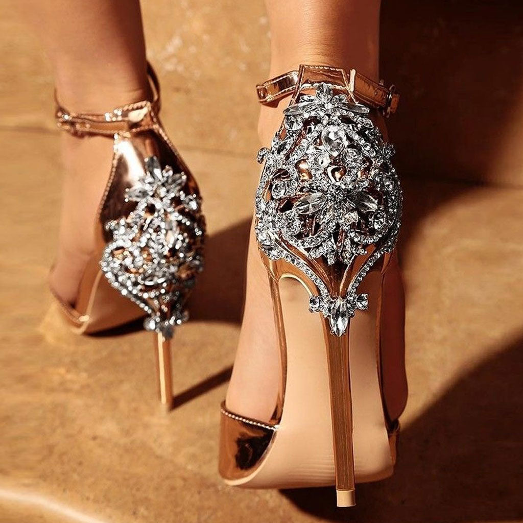 Add your roster of occasion-wear sandals with this champagne gold pair that'll elevate all your light-colored gowns to a breathtaking level. Destined to make your beauty armed to the heels. this alluring pair has rhinestone ornaments at the back followed by ultra-slim stiletto heels to add up sultriness and femininity. Cut from patent faux leather into an open round toe silhouette. these glittering heels are featured with shiny bright upper band and ankle strap buckles that add style as well as provide a firm fit. Go get them and make every step count in every important moment of your life.