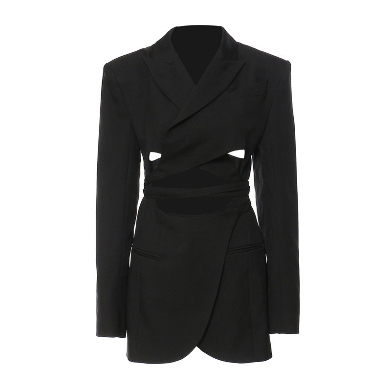 A lesson in how to nail your own personal style. The designer dress presents a sculpted slim silhouette with the artful cut-outs on the waist and back and is further defined by its crossover collar which ultimately wraps around the waist with strappy ties. The structured shoulders. peak lapel. long sleeve and front pockets make it the classic blazer jacket style that we all obsessed with. With the flirty mini length skimming the thigh. this blazer dress is timeless and sophisticated. serving as your top-pick for the years to come. Match it with your favorite heels and a clutch bag for a night-out look.