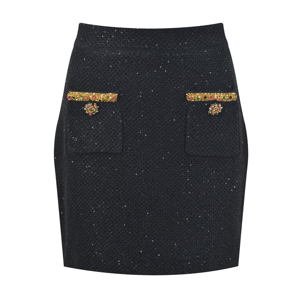 Turn heads in this sparkly bodycon mini skirt. a dazzling blend of acrylic and wool. Its high waist is trimmed with luxurious multicolored crystals. adding a dash of glamour to your stride. Two handy patch pockets merge style with convenience. making it a practical choice for a night out. Adorned with sequins. this black skirt is a showstopper. fitting like a dream and sparkling like a starry night. It's the perfect pick for those who love to shine and stand out. a true designer gem with our golden-trimmed knit cardigan to be the ultimate knit duo.