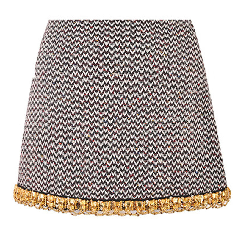 Strut in style with this lush. high-waisted tweed mini skirt. The bodycon fit hugs your curves in all the right ways. making it a knockout for any occasion. Its short hemline is lavishly adorned with gold-tone crystals. beads. and sequins. adding a splash of sparkle to your step. Perfect for those who love a bit of bling and aren't afraid to show it. this winter designer miniskirt is 'the cat's meow' in any fashionista's collection. Ideal match with our multicolored tweed jacket.