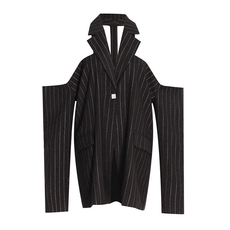 We can always count on striped blazers to serve up a stylish and edgy look. and this blazer from our unique designer brand is no different. We love her combination of an oversized loose-fitting silhouette. cutout shoulders and an open back which is further connected with a rhinestone strap to the back for a sparkly finishing touch. The lapel collar is fastened with a square crystal button to echo the shine on the back. It also features two flap pockets and a rear vented hem to enhance the suit profile. Get creative by pairing yours with a tiered tulle skirt and elegant slingback pumps to complete an ensemble that you'll feel instantly pulled together.