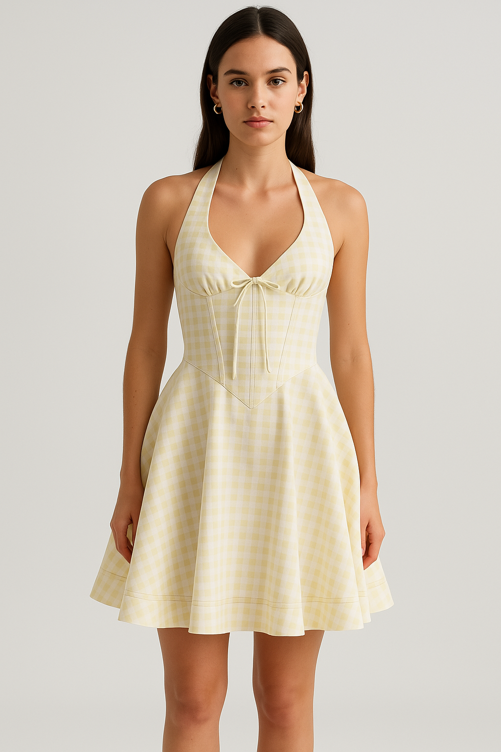 The Precious Dress embodies simplicity and elegance with its checkered pattern. perfect for sunny days or casual outings. The halter neck design and flattering fit bring timeless style. making this piece a staple for every wardrobe.