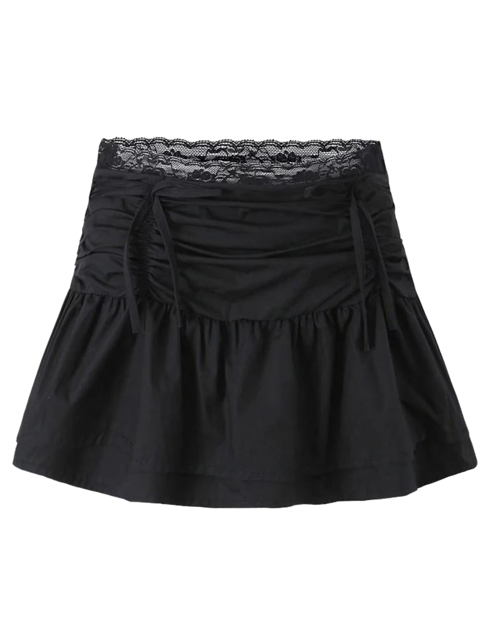 The Pretty Baby Skirt is a flirty and chic piece with ruched details and a lace trim. perfect for casual or semi-formal looks.