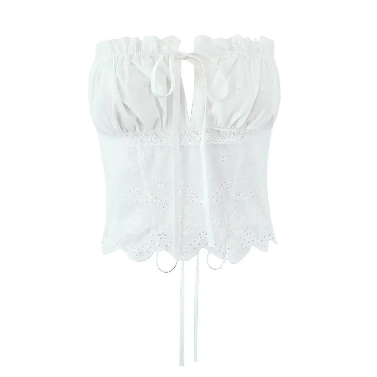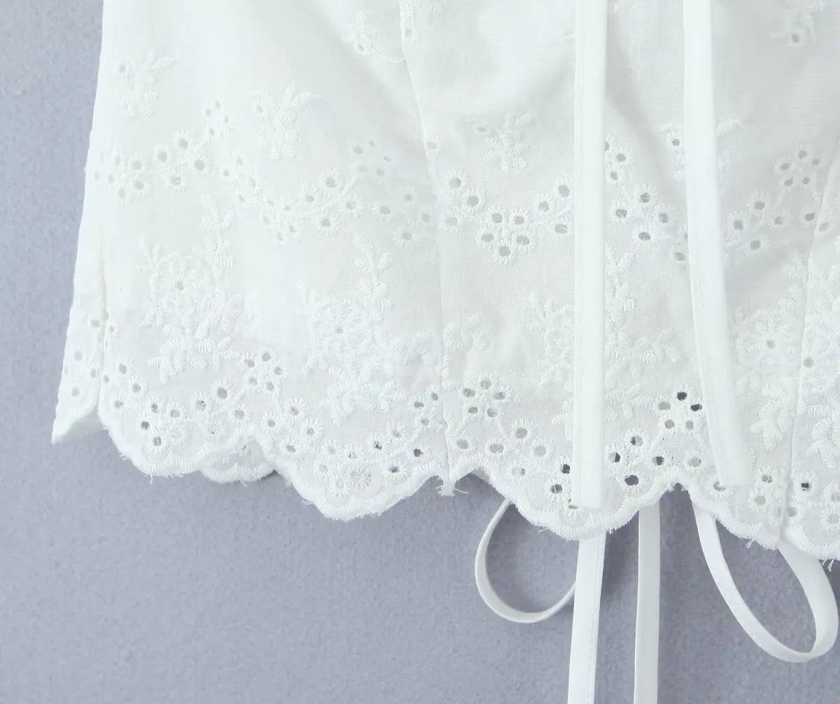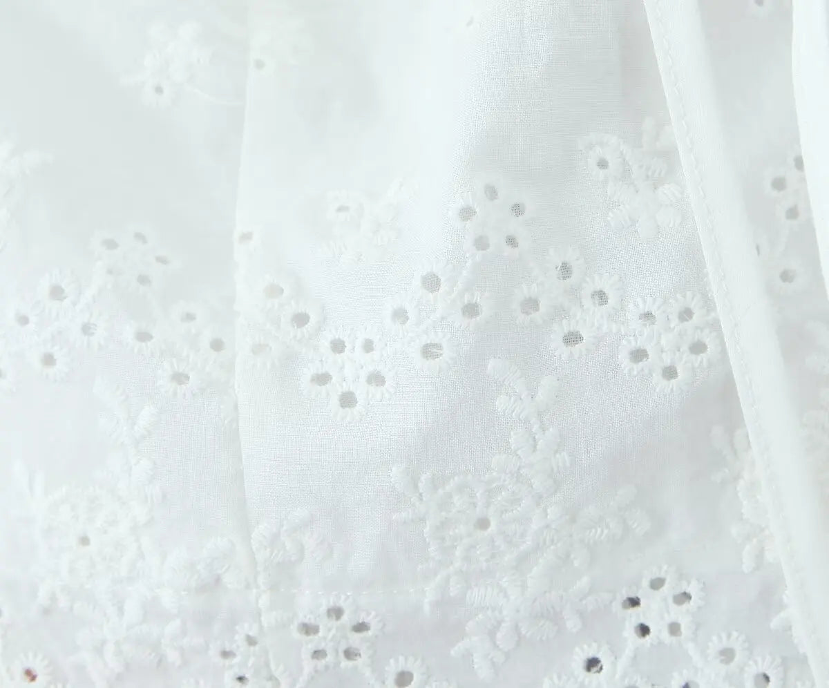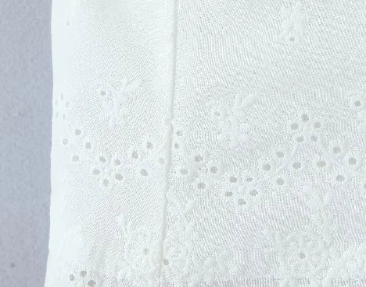 The Rea Top is a charming and elegant piece featuring delicate eyelet embroidery. It has a feminine design with a stretchy waistband for a comfortable fit. making it perfect for casual days out or pairing with a skirt for a chic ensemble.