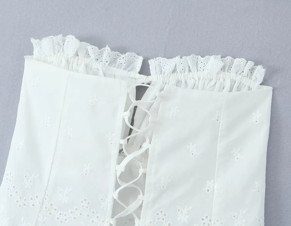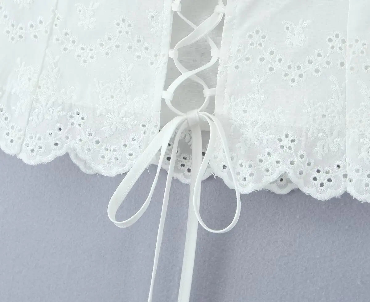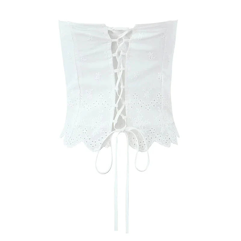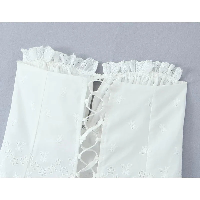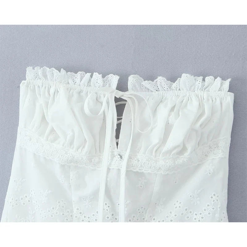 The Rea Top is a charming and elegant piece featuring delicate eyelet embroidery. It has a feminine design with a stretchy waistband for a comfortable fit. making it perfect for casual days out or pairing with a skirt for a chic ensemble.